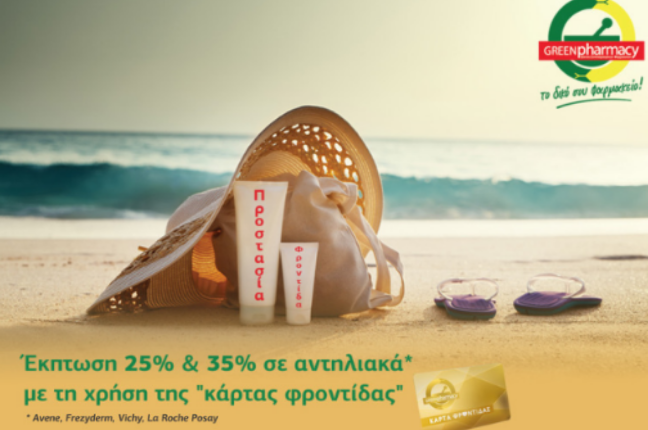 Από τις 15 Μαϊου έως και τις 31 Ιουλίου βρείτε τα αγαπημένα σας αντηλιακά με έκπτωση 25% και 35 % με τη χρήση της “Κάρτας Φροντίδας”, σε ένα φαρμακείο του δικτύου Green Pharmacy.